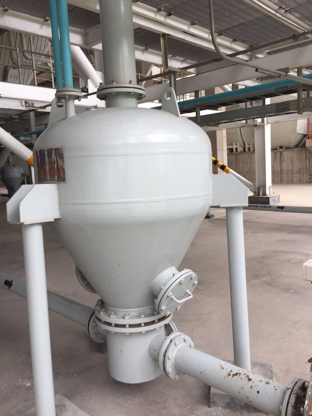 倉(cāng)泵內(nèi)部物料在壓縮空氣作用下,通過(guò)倉(cāng)泵頂部的輸送管道向上輸送。倉(cāng)泵底部設(shè)有氣化板,壓縮空氣通過(guò)氣化板使物料流態(tài)化,